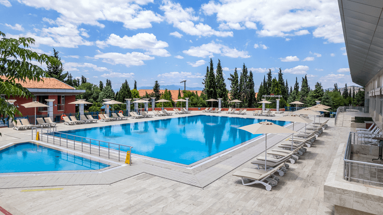 Modern , konforlu ve rahat şezlonglarla çevrelenmiş açık ve kapalı Thermal yüzme huvuzlarında konforlu wellness hizmetiyle sizleri ağılıyoruz.